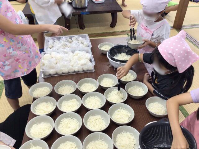 今日は夏にぴったりのメニュー「ぶっかけそうめん」と「フルーツポンチ」を子どもたちが作りました!