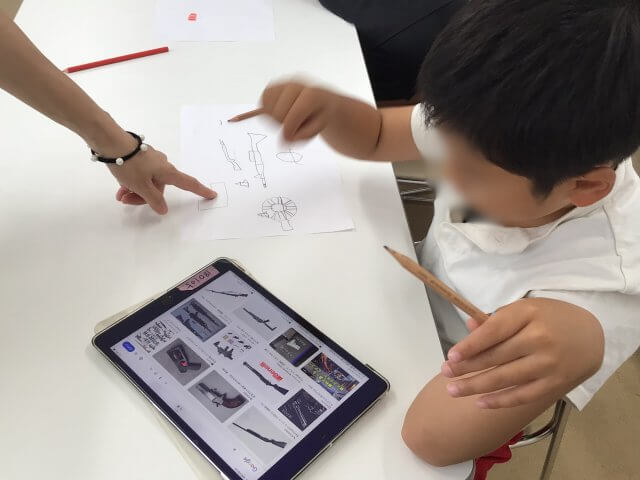 まず子どもたちは、色々な色鉛筆を使って自分で作りたいデザインを考え、たくさんの布の中から好きな色や柄を選びます。ハサミで切ったり、ペタペタ貼ったりと、思い思いの形を作っていきます。