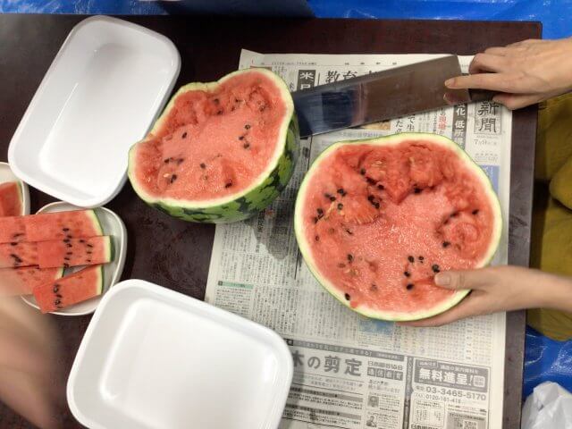食後は、夏の定番イベント「スイカ割り」に挑戦!目をかくした子どもたちは、友達の「右!」「左!」の元気な掛け声や、手を叩く音を頼りに慎重に進みます。スイカにたどり着いた瞬間の歓声と、割れたスイカのジューシーさに、子どもたちも大盛り上がり!