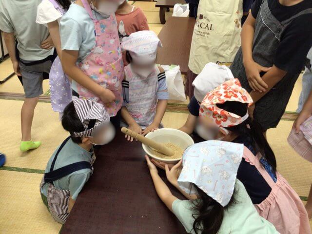 すり鉢でごまをすり、味噌やだしと合わせると、あっという間に夏にぴったりの冷たくてさっぱり美味しい冷や汁の完成です!「初めて食べたけど美味しい!」「もっと食べたい!」と、みんな夢中で食べていました!