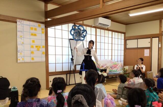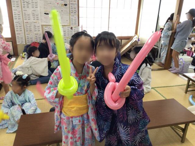 その後は、みんなで剣作りにチャレンジ。風船をねじりながら、自分だけのオリジナル剣を完成させると、「見て見て!」と友達同士で見せ合い、楽しそうな笑い声が響き渡りました。