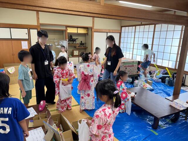 子供達は「お店屋さん」と「お客さん」に分かれ、それぞれの役割で交代しながら夏祭りを満喫。子供たちは笑顔でお店を回ったり、ゲームに挑戦したり、友達と楽しそうにやり取りしながら、あっという間に時間が過ぎていきました。