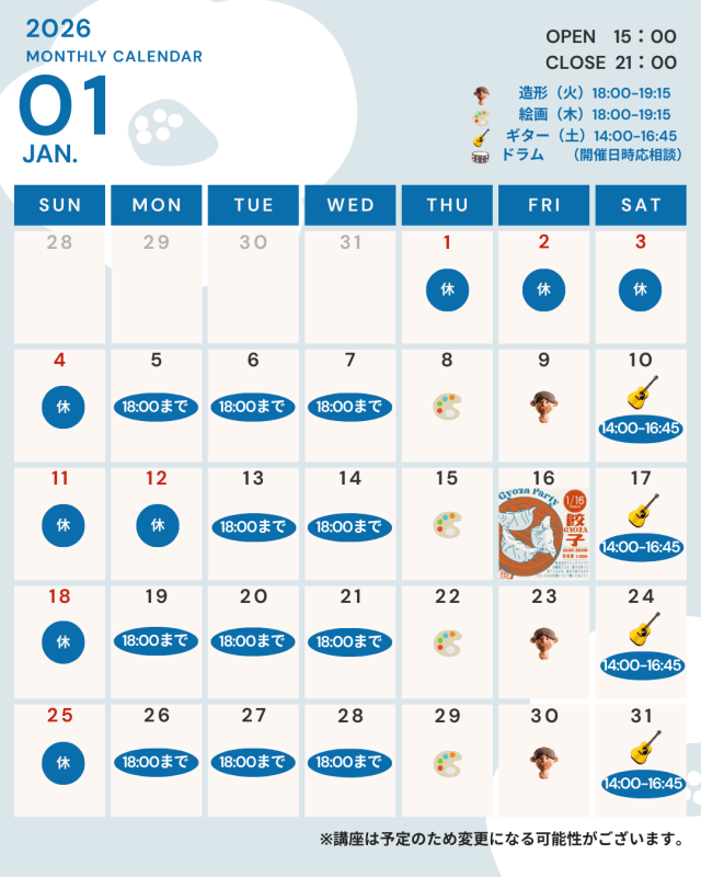 (木)18:00-19:15 | 12,000円→6,000円 | 3,000円→1,500円 |