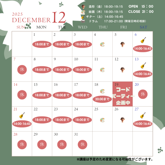・講座は前日までに振替のご連絡をいただけますと、半年以内に振替可能です。(他講座受講可能です)